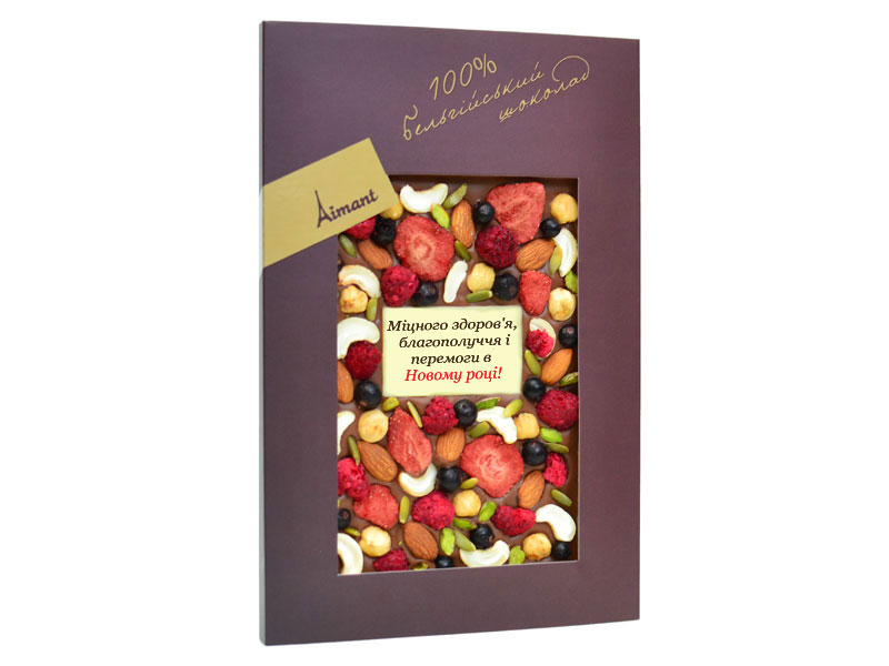 Молочный бельгийский шоколад (Сallebaut, 35% какао), малина, клубника, черная смородина, миндаль, кешью, фундук, фисташки и шоколадная надпись: "Міцного здоров'я, благополуччя і перемоги в Новому році!" .