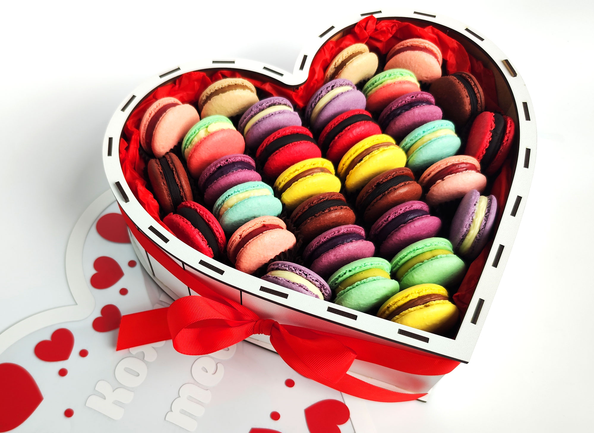 Яркий и красочный набор неповторимых макаронс (макарун) от Aimant (31шт., ассорти из 10 разных видов с любимыми и Новыми вкусами: клубника-ваниль, фисташка-роза, шоколад, лаванда-черника, маракуйя, черная смородина-ваниль, шоколад-вишня, мята-лайм, кофе и кокос-клубника; могут немного отличаться от тех, что на фото).