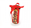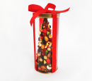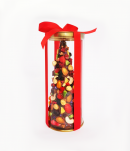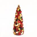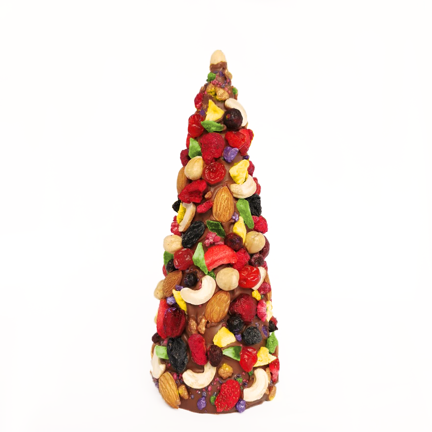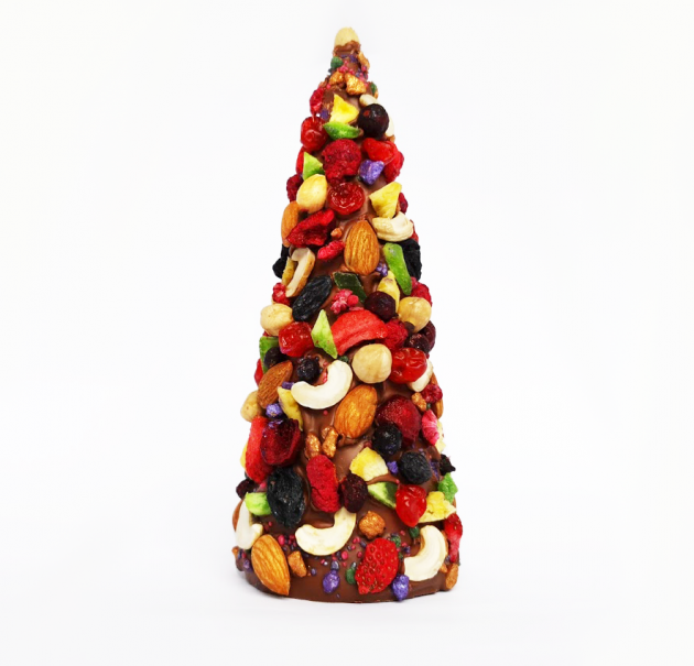 Новогоднее дерево из молочного бельгийского шоколада (35% какао, Сallebaut) с наполением из орехов (миндаля, фундука, кешью), ягод (вишня сушеная и засахаренная, малина, клубника, смородина, изюм), сухофруктов (ананас, помело, инжир) и гранул мяты, розы и фиалки.