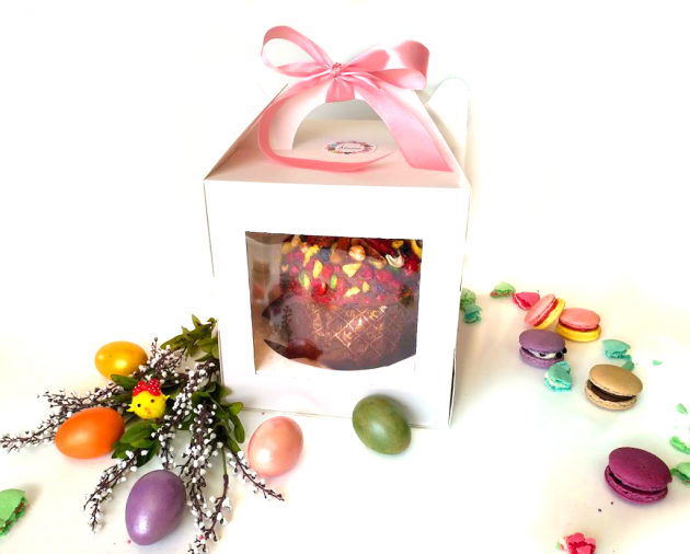 Паска упакована в коробку с прозрачным окошком. Размер коробки: 20*22*20 см.