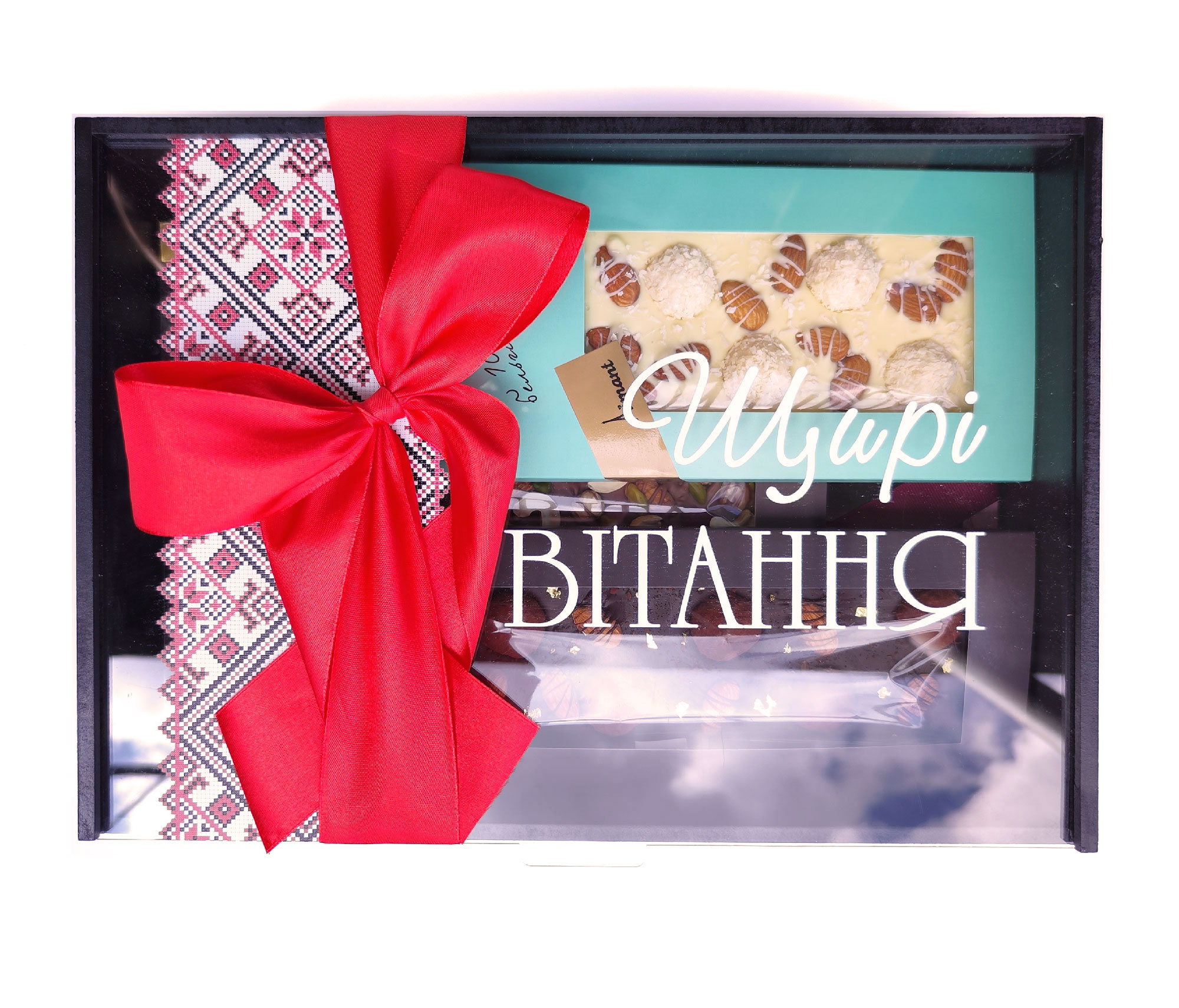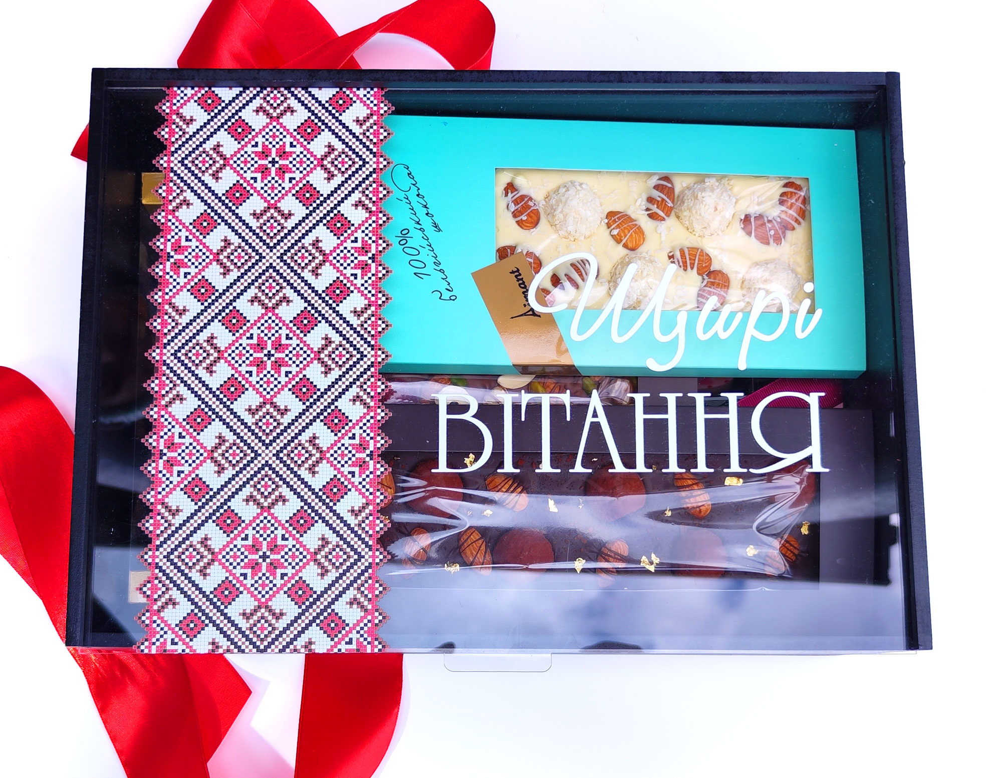 Молочный бельгийский шоколад «С наилучшими пожеланиями!» ((35% какао, Сallebaut), фисташка, кешью, миндаль, фундук, грецкий орех, пекан, вишня засахаренная и шоколадная надпись, 236г);