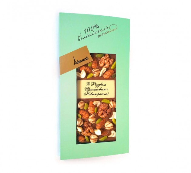 Молочный бельгийский шоколад ( 35% какао, Сallebaut) фисташки, кешью, миндаль, фундук, грецкий орех и ваша шоколадная надпись "З Різдвом Христовим і Новим роком!"
