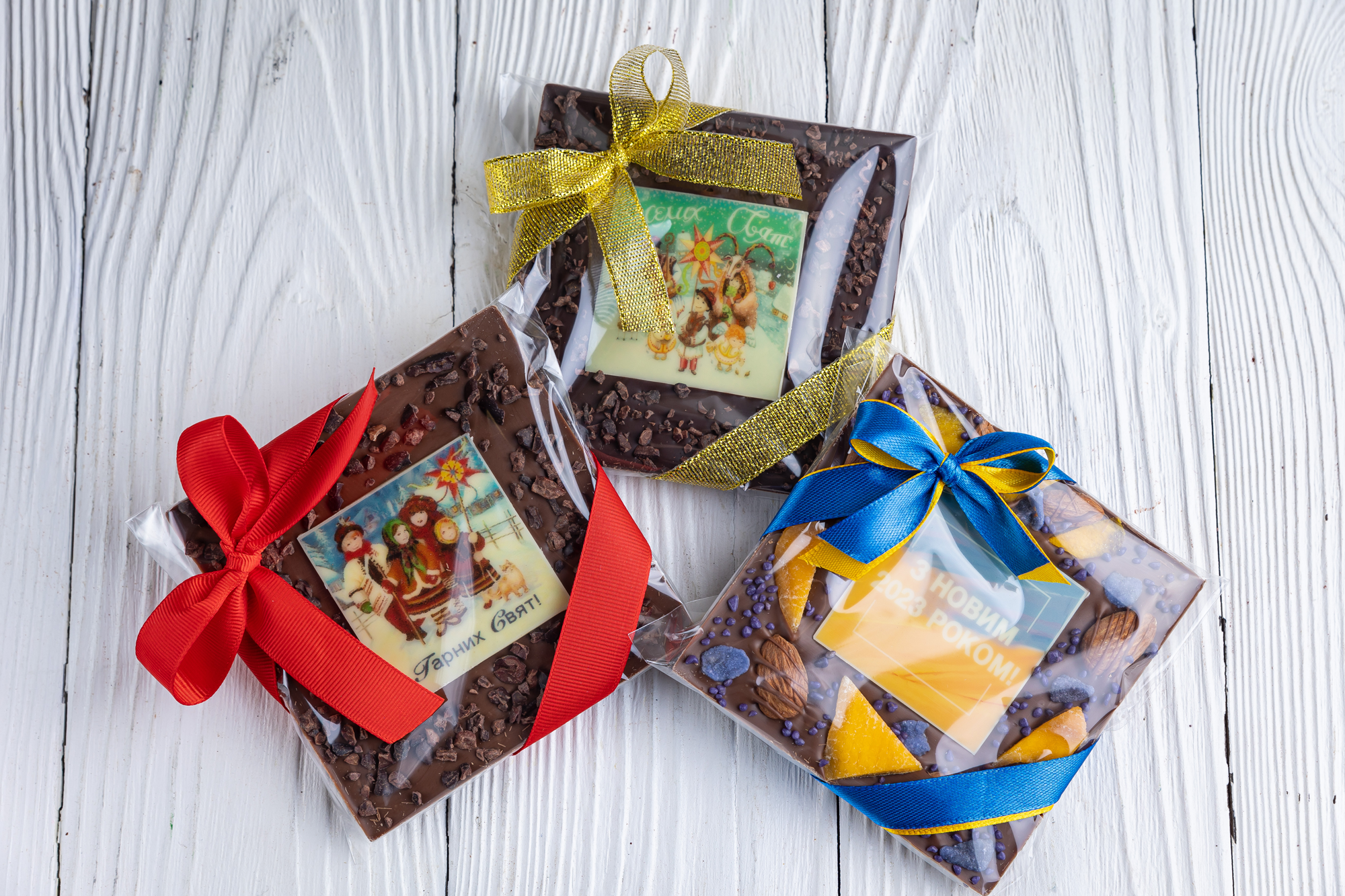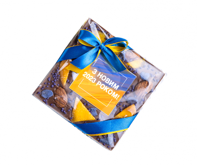 Молочный бельгийский шоколад (35% какао, Сallebaut) с манго, миндалем, лепестками и гранулами фиалки и шоколадная картинка "З Новим 2026 роком!"