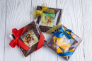 Размер - 10*10 см, шоколад в прозрачном пакетике с лентой.