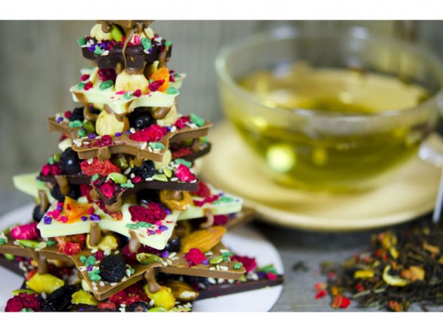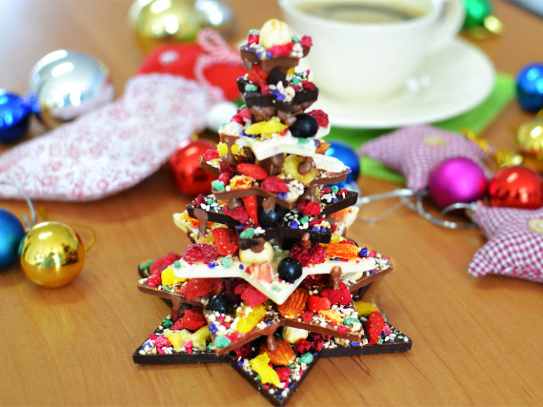 "Ёлочка" из молочного, чёрного и белого бельгийского шоколада с орешками, сухофруктами и капельками засахаренных цветов. Хороший новогодний подарок для взрослых и детей.