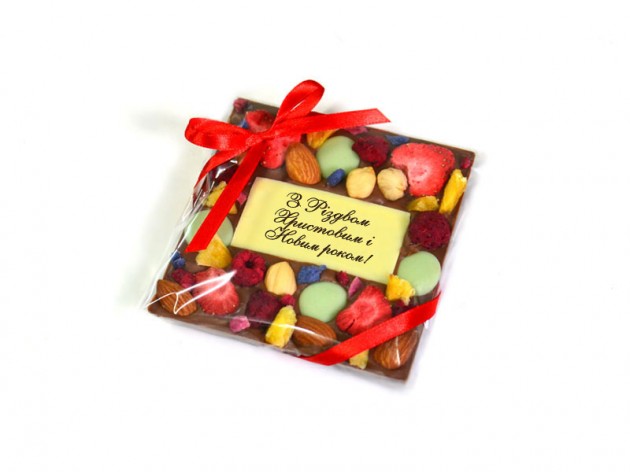 Молочный шоколад (Сallebaut, 35% какао), клубничка, малинка, фундук, миндаль, ананас, шоколад "лайм", лепестки розы, фиалки и шоколадная надпись "З Різдвом Христовим і Новим роком!".