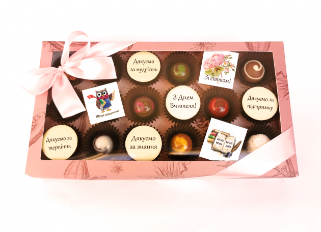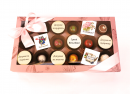 Ассорти конфет из 100% бельгийского шоколада: "Классический", "Кофейный" и "Кокосовый" трюфели, "Малибу", "Марципан с орешком", "Корица", "Фундук в карамели", "Сердце тропиков", "Ореховый рай", "Медовые", "Вкус Ирландии", "Карамельные орешки", "С Вишенкой", "Чери Леди", "Кофе-Мартини" и "Шампанское с сусальным золотом". 18 шт;