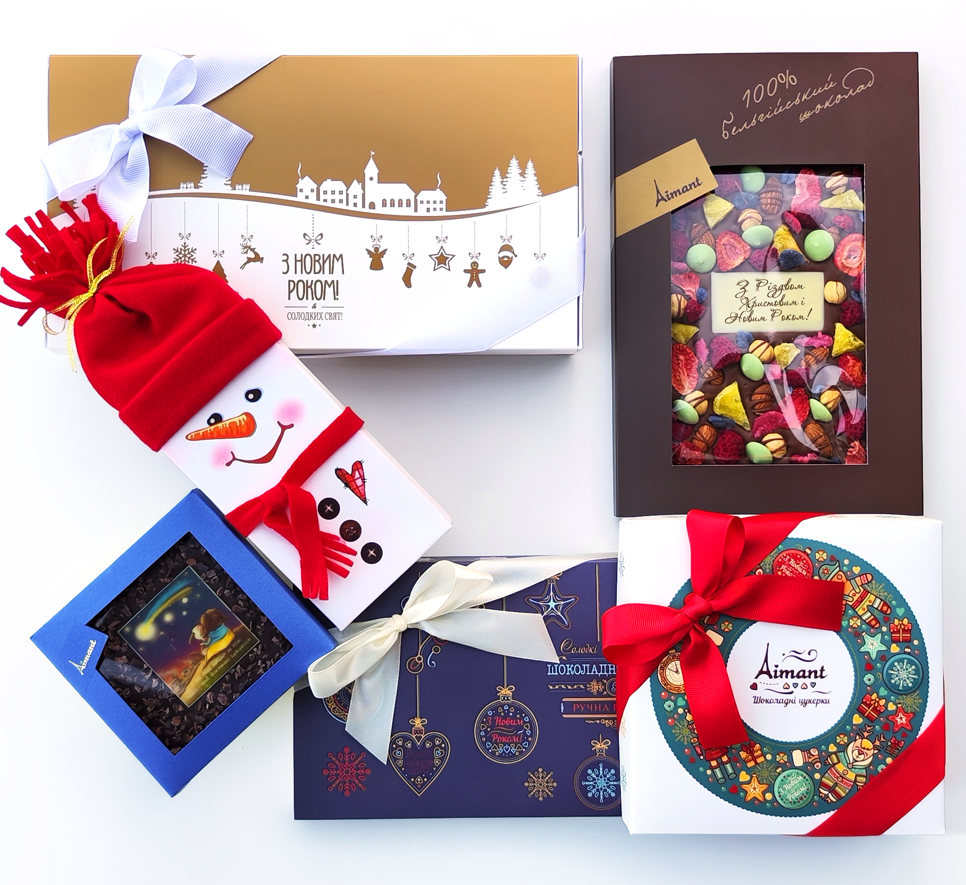 - Асорті цукерок із 100% бельгійського шоколаду "Happy New Year": "Класичний", "Кавовий" та "Кокосовий" трюфелі, "Малібу", "Марципан з горішком", "Чорнослив", "Кориця", "Фундук у карамелі", "Серце тропіків", "Горіховий рай", "Медові", "Смак Ірландії", "Карамельні горішки", "З Вишенькою", "Чері Леді", "Кава-Мартіні" та "Шампанське з сусальним золотом" (27шт., 324г);