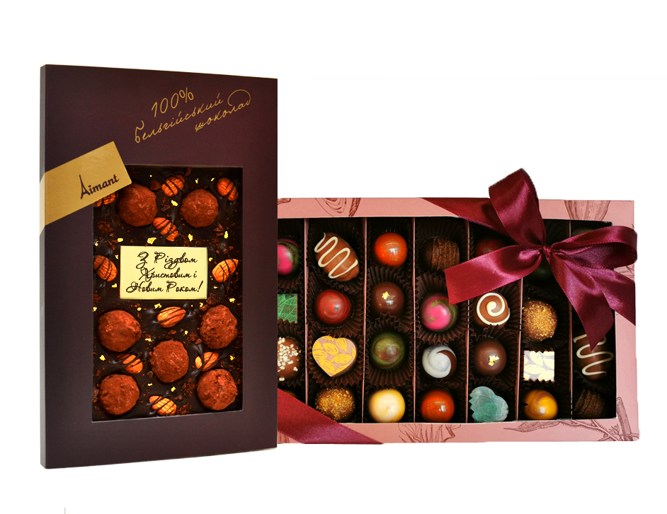 Шоколадна плитка "Трюфелі з золотом "(244 г) і набір цукерок з бельгійського шоколаду "Преміум колекція " (асорті, 32 шт., 384 г).